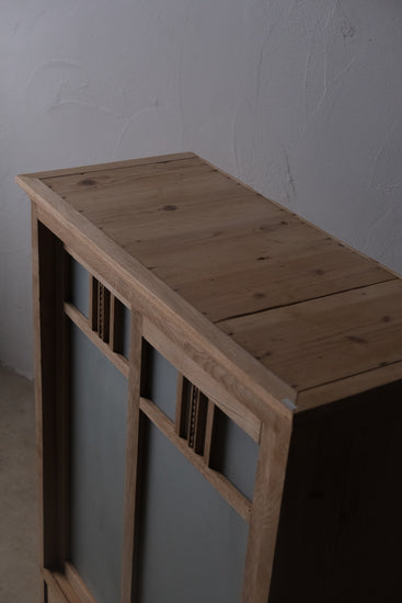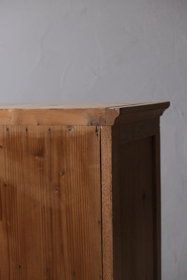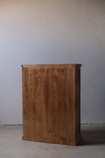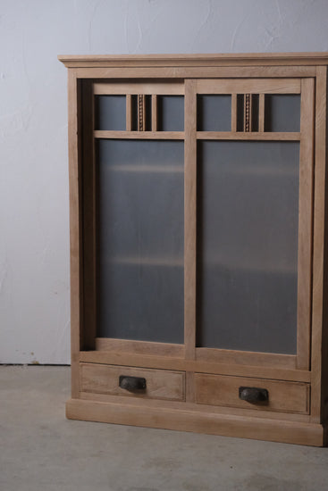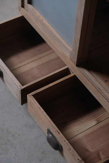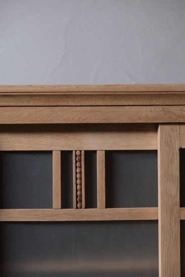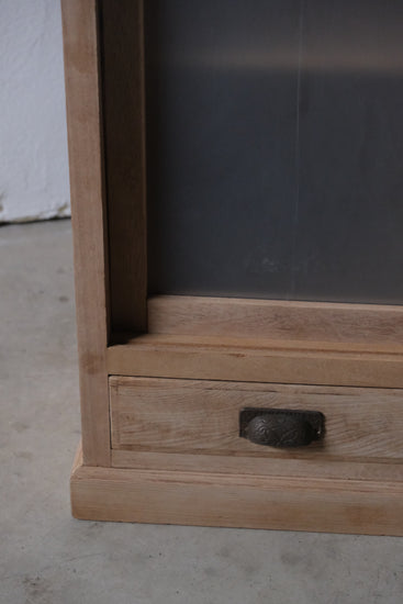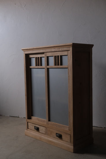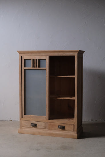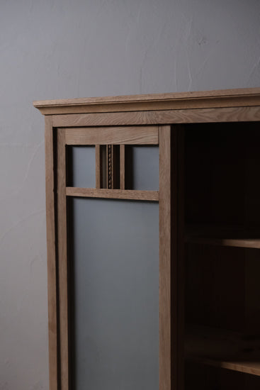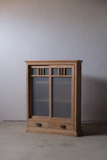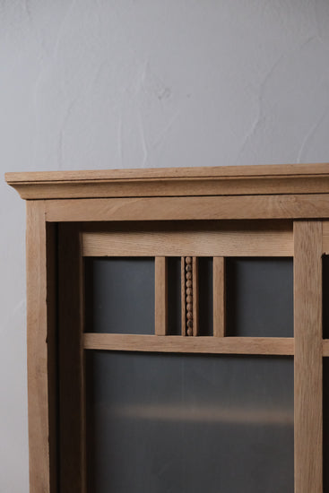 木部の装飾と磨りガラスが美しいガラス戸棚です。